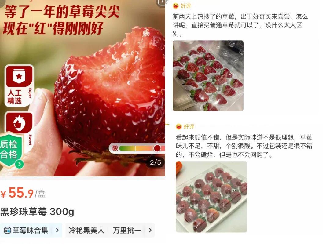 在电商平台搜索,其售价普遍达到600元/kg,一盒将近300元的黑草莓,到手仅有11颗。