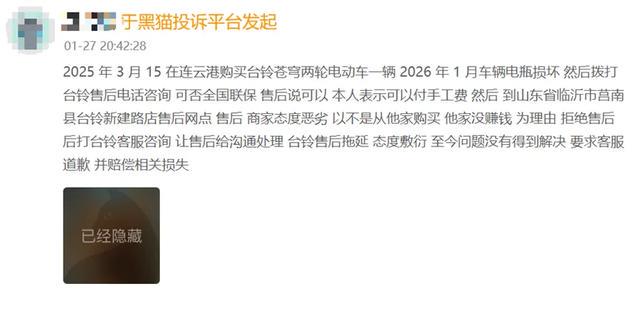 在黑猫投诉平台上,关于台铃的有效投诉量已超过2000条,问题主要集中在「电池质量与续航不达标」、「售后服务推诿」等方面。
