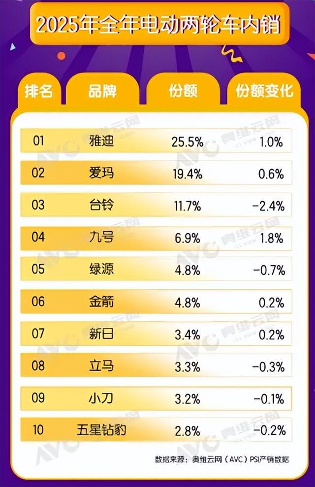 据奥维云网的数据,2025年电动两轮车行业排名第一、第二的雅迪和爱玛市场份额稳步增长,「新势力」九号则快速追赶,份额占比增长1.8%。