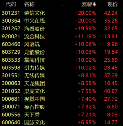 文化传媒板块走高,荣信文化、中文在线、海看股份、掌阅科技、引力传媒等股涨停。