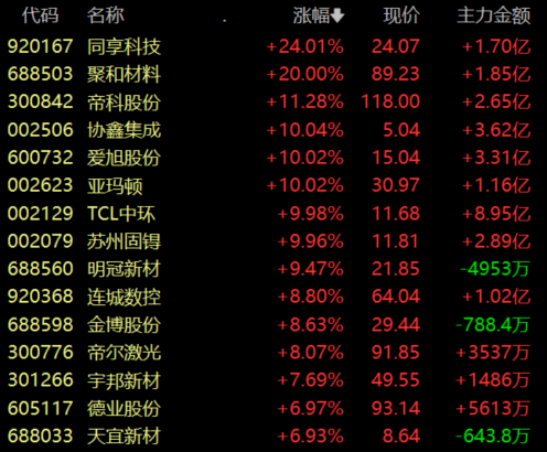 具体来看,光伏设备板块表现强势,聚和材料、协鑫集成、TCL中环等多股涨停,同享科技涨超24%。