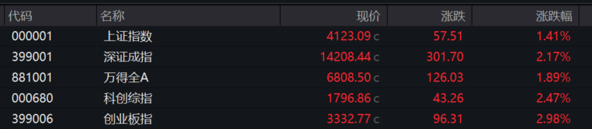 2月9日,A股三大指数集体上涨。截至收盘,沪指涨1.41%,深成指涨2.17%,创业板指涨2.98%,科创综指涨2.47%。