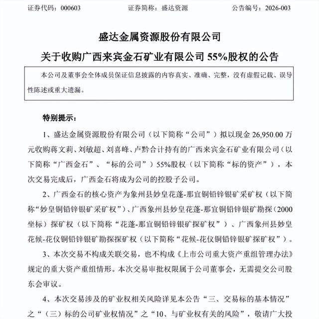 ▲盛达资源收购来宾金石矿业的公告 来源:盛达资源官网