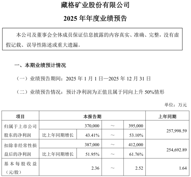 从业绩上看,藏格并不狼狈。2025年年度业绩预告显示,公司预计归母净利润37亿至39.5亿元,同比增长最高超过53%,扣非净利润增幅甚至更高。钾、锂、铜三条业务线同时运转,放在矿业里,这已经算是优秀。