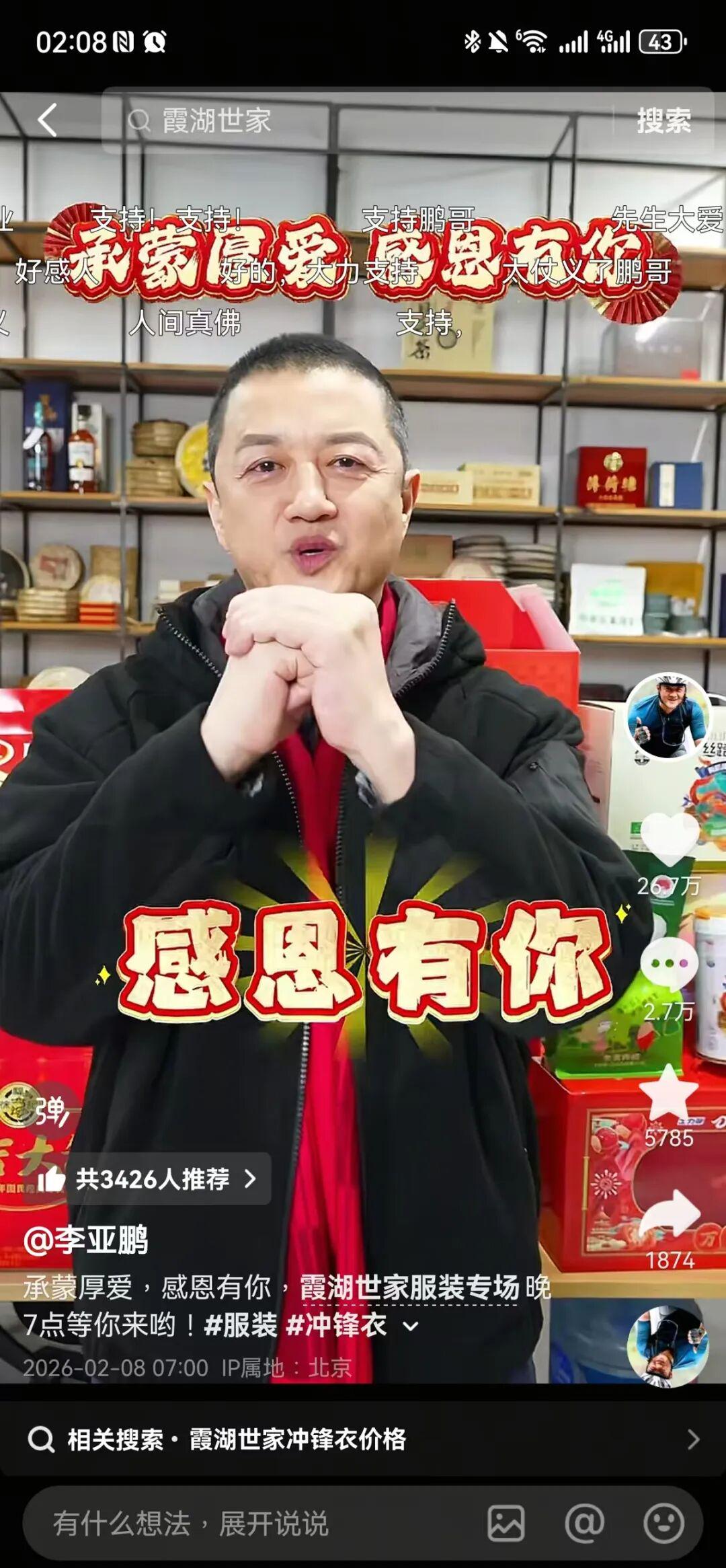 2月8日,李亚鹏专门给为嫣然医院捐款的企业,加开了一场直播带货。第三方平台数据显示,李亚鹏8日晚的“承蒙厚爱感恩有你”主题直播持续了3小时33分,观看人次1684.2万,销售额7500万-1亿元。当晚直播间售卖的品牌包括莲花味精、卫龙、豪士面包、茶口乐、霞湖世家等,其中莲花味精相关商品销量超过30万单。该直播间当晚也长时间占据“年货热卖榜第1名”的位置。