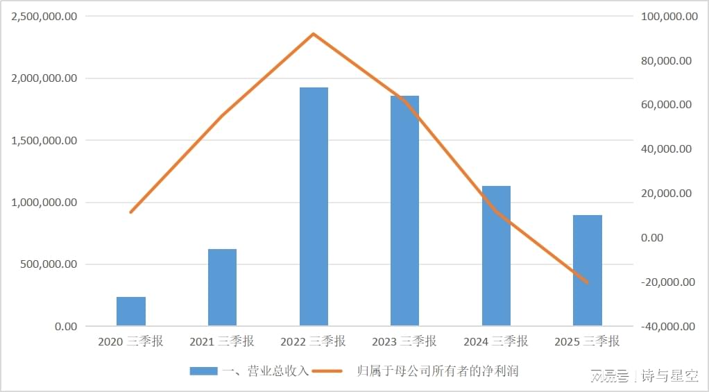2025年前三季度,公司实现营业总收入89.86亿元,同比下降20.64%;归母净利润亏损2.04亿元,同比大幅下滑274.96%;扣非净利润亏损2.21亿元,同比降幅更高达348.89%。单季度数据显示,2025年第三季度营收27.37亿元,同比下降38.29%;归母净利润亏损1.35亿元,同比降幅达227.45%。