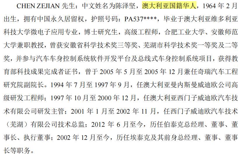 截至招股说明书签署日,公司股东芜湖佳泰以及澳洲埃泰克同受CHEN ZE JIAN控制。芜湖佳泰、澳洲埃泰克直接持有公司27.77%的股份,芜湖佳泰为员工持股平台顺泰投资、伯泰克企管、宜泰企管、泽创企管、芜湖易泰的执行事务合伙人,同时芜湖佳泰与顺泰投资、伯泰克企管、宜泰企管、泽创企管、芜湖易泰、沈嵘、LUOCHANGAN等7名股东签署《一致行动人协议》,约定在提出议案或行使表决权时,其他一致行动人同意无条件支持芜湖佳泰的决定,芜湖佳泰通过前述一致行动关系间接控制公司6.59%的表决权。