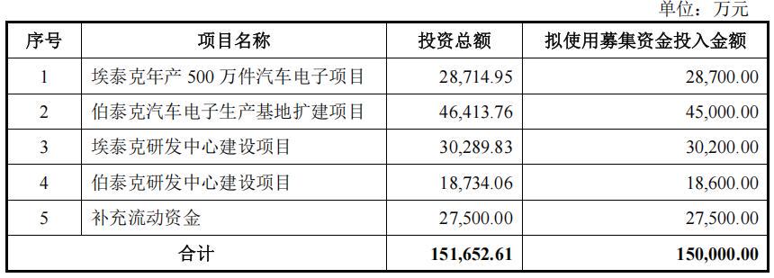 最近过会的芜湖埃泰克汽车电子股份有限公司(简称:埃泰克)拟在沪主板上市,保荐机构为华泰联合证券。公司本次发行前的总股本为134,317,993股,如本次公开发行股票数量为44,772,665股,占发行后总股本的25%。公司拟使用募集资金15亿元,用于埃泰克年产500万件汽车电子项目、伯泰克汽车电子生产基地扩建项目、埃泰克研发中心建设项目、伯泰克研发中心建设项目和补充流动资金。