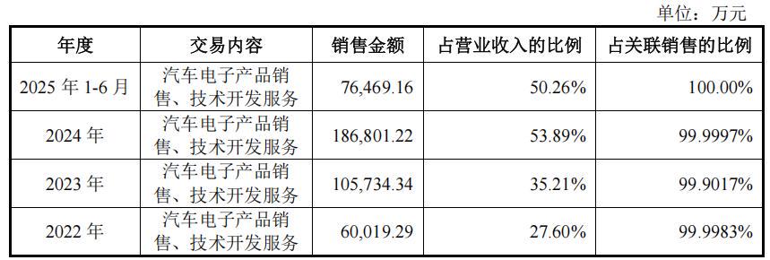 报告期内,埃泰克对关联方销售收入的金额分别为6.002亿元、10.584亿元、18.68亿元和7.647亿元,占公司营业收入的比例分别为27.60%、35.25%、53.89%和50.26%。其中,公司对第一大客户奇瑞汽车销售收入分别为6.001亿元、10.573亿元、18.68亿元和7.647亿元,占营业收入的比例分别为27.60%、35.21%、53.89%和50.26%,占比较高,为关联销售的最主要构成。奇瑞汽车作为公司主要客户之一,关联销售金额与公司经营业绩高度相关。