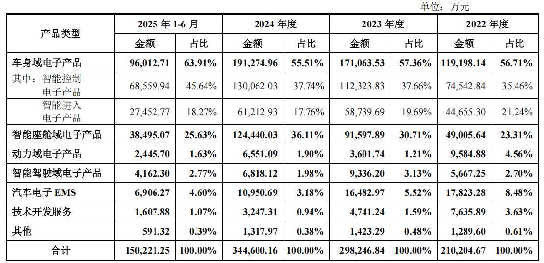 报告期内,公司车身域电子产品销售收入占比分别为56.71%、57.36%、55.51%和63.91%,智能座舱域电子产品销售收入占比分别为23.31%、30.71%、36.11%和25.63%,二者合计占主营业务收入的比例分别为80.02%、88.07%、91.62%和89.54%,是公司主营业务收入的主要来源。