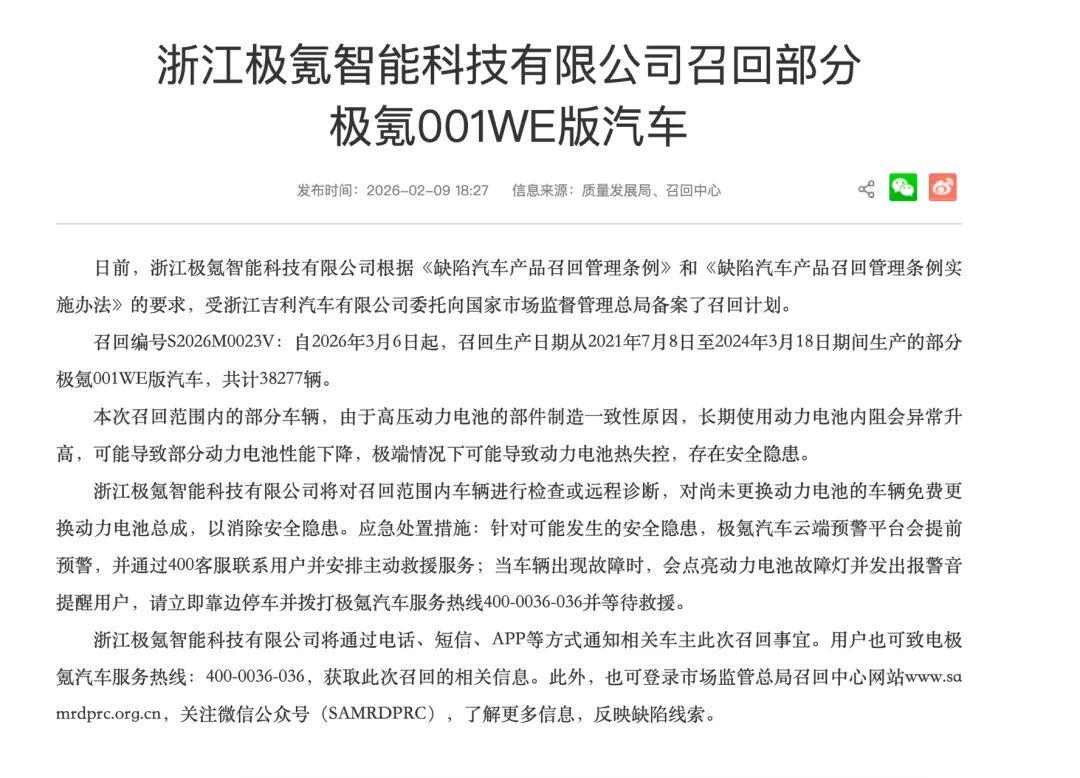 2月9日,国家市场监督管理总局质量发展局发布一则关于极氪的召回公告。