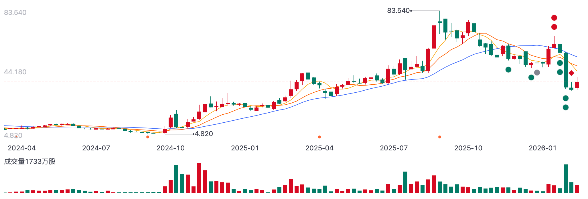 然而,跌势并未就此停止,在接下来的多个交易日里,九方智投控股的股价继续一路下行。截至2月9日收盘,其股价较此前的最高点83.54港元/股,已经跌去了近六成。