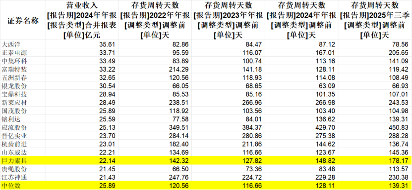 与此同时,库存去化也面临挑战。2022-2024年及2025年前三季度,巨力索具的存货周转天数分别为142.32天、127.82天、148.82天和178.17天,同样明显领先可比上市公司的中位数。