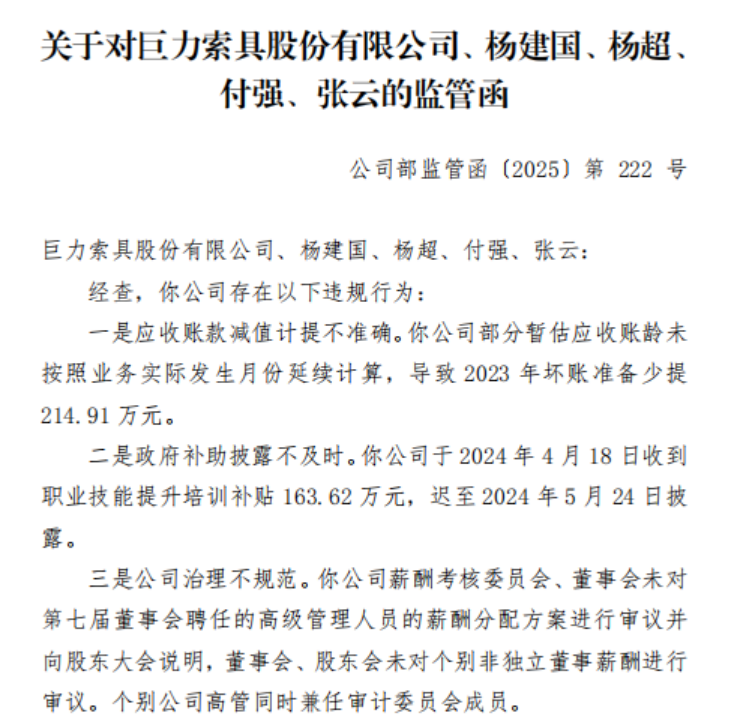 2025年12月19日,深交所出具监管函,称巨力索具存在以下违规行为,包括应收账款减值计提不准确、政府补助披露不及时和公司治理不规范。