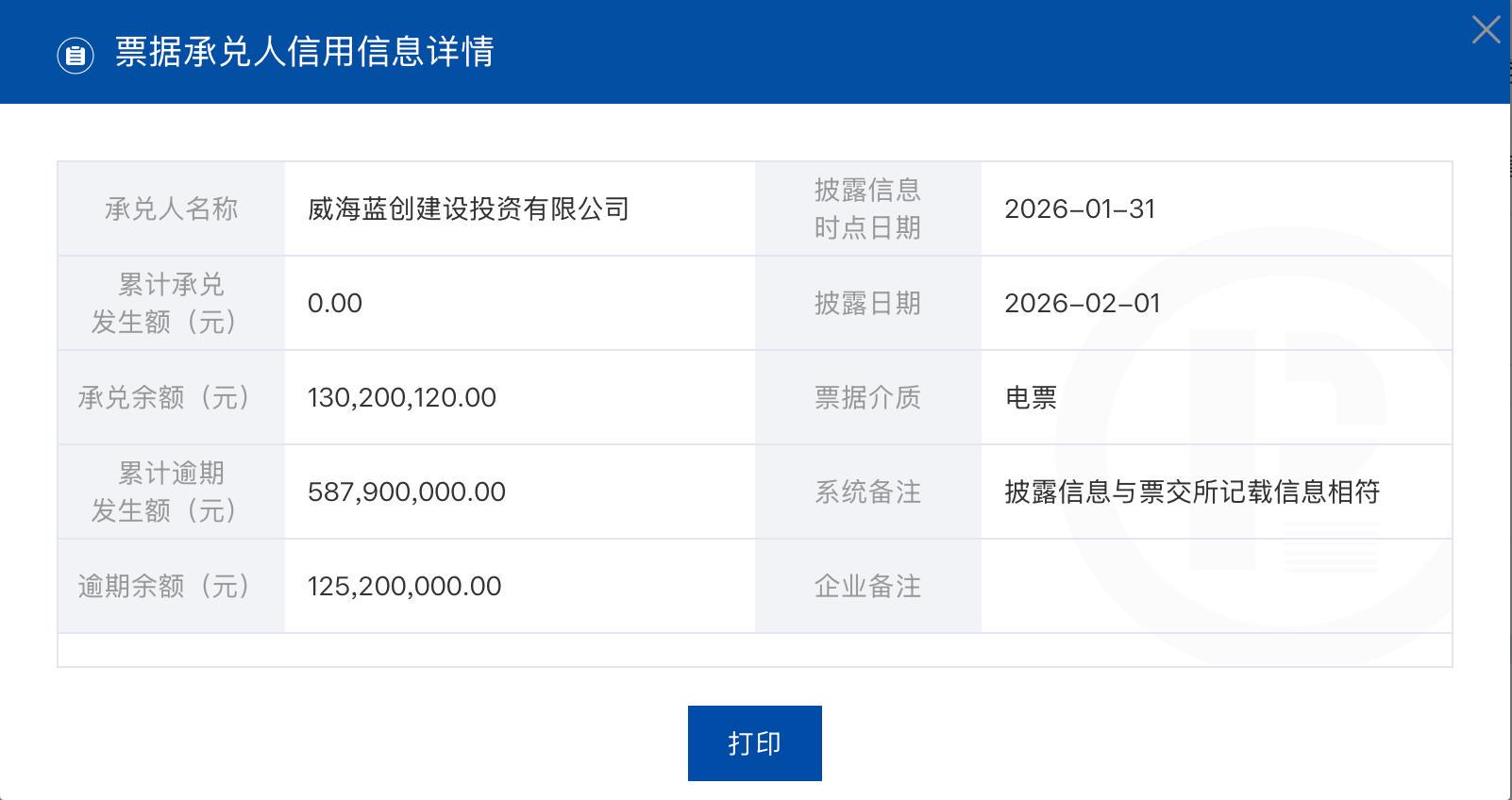 上海票据交易所最新披露数据显示,截至2026年1月31日,威海蓝创建设投资有限公司(下称“威海蓝创”)票据承兑逾期余额已达1.25亿元,累计逾期发生额更是高达5.88亿元。