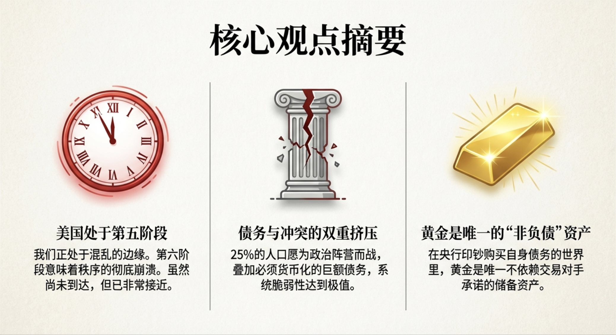 桥水基金创始人瑞·达利欧在最新访谈中发出警告,指出美国已进入帝国兴衰大周期的“第五阶段”,特征是极度政治极化与债务失衡,距离秩序崩溃的“第六阶段”仅一步之遥。他强调,美国面临严峻的债务供需问题,央行印钞应对赤字将导致货币贬值。针对投资者,达利欧明确建议在投资组合中配置5%-15%的黄金,并称黄金是“唯一非他人负债的资产”。他呼吁投资者关注“财富”与“金钱”的区别,并通过资产分散化和选择稳定的居住地来对冲潜在的社会动荡与地缘风险。