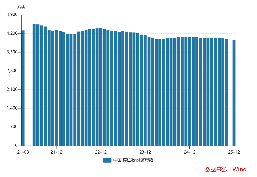 截至2025年12月,我国能繁母猪存栏量3961万头,还是高于3900万头的正常保有量。更值得警惕的是,产能出现边际回升迹象。Mysteel数据显示,2026年1月份重点样本企业综合能繁母猪环比增长0.01%,其中规模场环比增长0.02%,中小散环比下降0.36%。