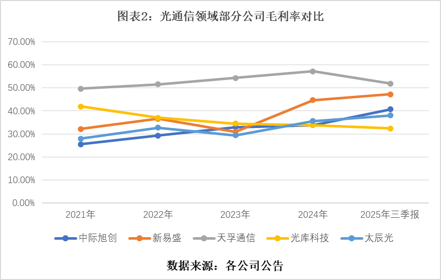 首先,由于身处上游环节,天孚通信竞争格局相对清晰。该公司毛利率常年保持在50%以上,高于中际旭创与新易盛。尽管2025年因有源器件销售占比提升和芯片成本上涨,导致其毛利率同比下降,但仍明显高于光库科技(300620.SZ)、太辰光(300570.SZ)等国内同业。