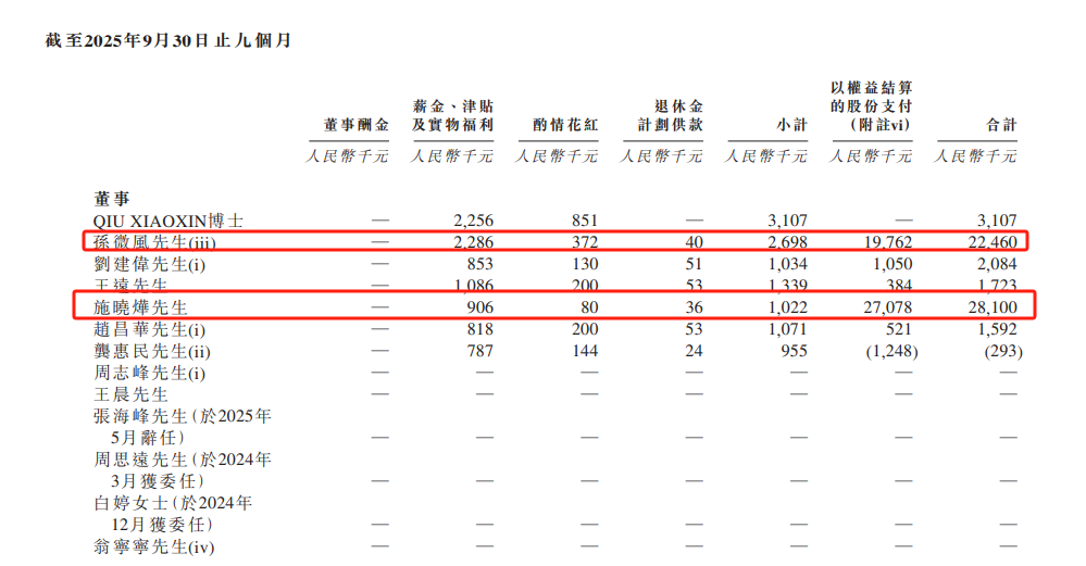 同时,红星资本局注意到,其高管录得千万元以上薪酬。2025年前三季度,CEO孙微风和CFO施晓烨薪酬分别为2246万元和2810万元,远高于创始人、董事长仇肖莘的薪酬311万元。不过,其薪酬构成中,以权益结算的股份支付占比较大:孙微风以权益结算的股份支付金额为1976万元,施晓烨为2708万元。
