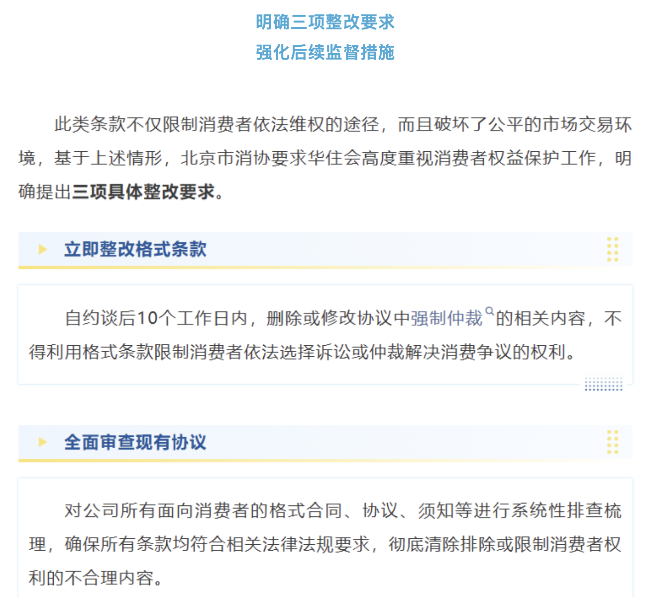 北京市消协调查发现,华住会2025年7月18日正式生效的《华住会个人会员计划与服务条款》(下称条款)第十一条第(二)项内容“若协商不成的,您同意将争议提交至上海仲裁委员会按照该会仲裁规则进行仲裁”,存在利用格式条款不合理限制消费者主要权利的问题,涉嫌侵害消费者合法权益。