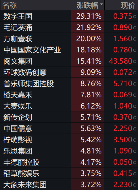 传媒板块大涨,数字王国大涨29%,阅文集团涨逾15%,大麦娱乐涨超6%。