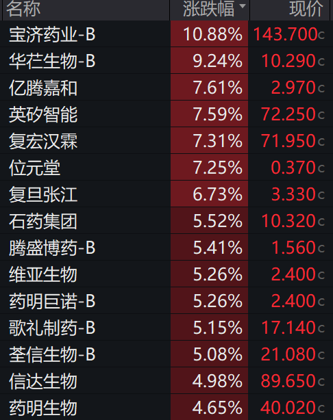 医药生物板块活跃,复旦张江涨超6%,石药集团涨逾5%,信达生物、药明生物、药明康德涨逾4%。