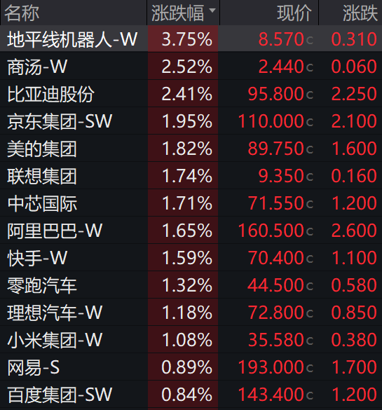 科网股多数上涨,地平线机器人涨超3%,商汤、比亚迪股份涨超2%,京东集团涨近2%,中芯国际、阿里巴巴、小米集团涨超1%。