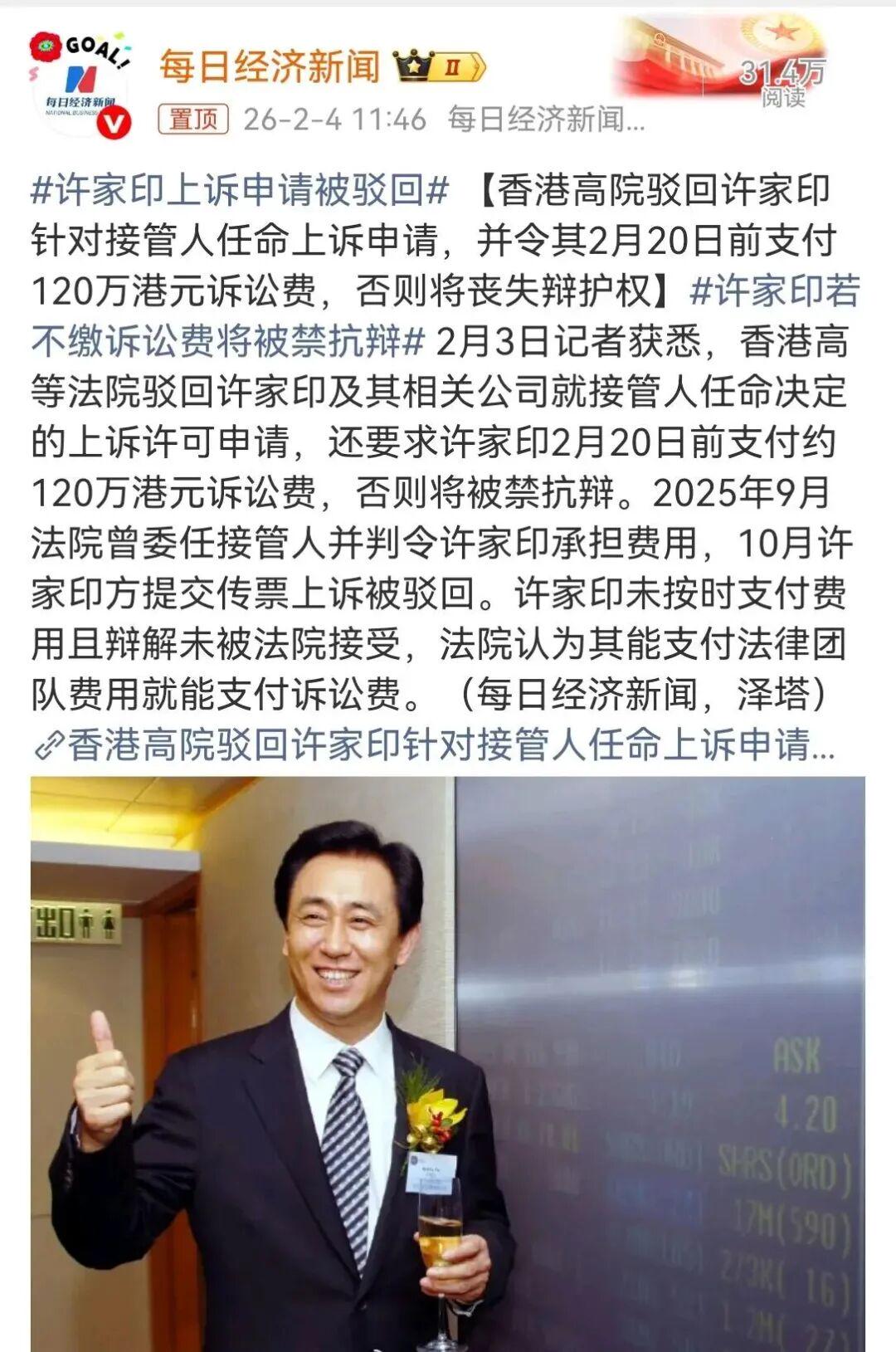 更惨的是,他连法庭抗辩资格都可能保不住。此前资产接管案的120万港元诉讼费,法院要求2025年11月4日前付清,可许家印一直拖延,律师借口他被拘留、无法授权动用2000万保证金。