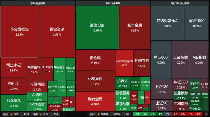 盘面上,小金属概念、贵金属、稀缺资源、稀土永磁、磷化工、化学原料领涨,但AI语料、机器人、影视概念、通信设备均下跌。