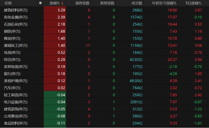 建筑材料领涨,有色金属、石油石化、钢铁、煤炭、基础化工等资源股涨幅靠前。6只建材股涨停,国际复材“20cm”涨停,宏和科技、再升科技、中材科技、中国巨石等涨停。