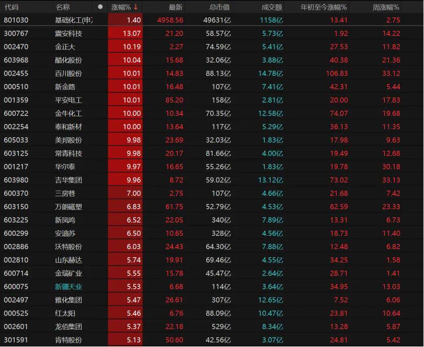 11只化工股涨停,金正大、醋化股份、百川股份、新金路、平安电工等个股涨停。