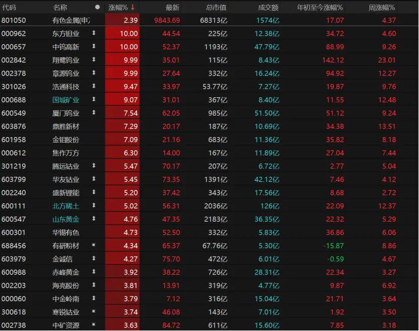 有色金属板块表现不错,东方钽业、中钨高新、翔鹭钨业、章源钨业涨停。浩通科技、国城矿业、厦门钨业、鼎胜新材均大涨。