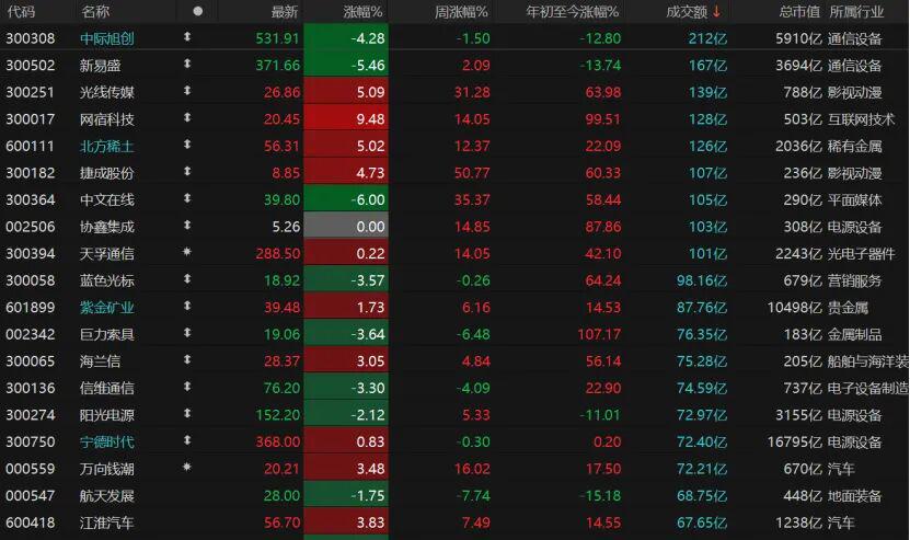 个股跌多涨少,2050只个股收涨,涨停股60只;3241只个股收跌,跌停股10只。交易热门股方面,9只个股日成交额超过100亿元,中际旭创跌逾4%报531.91元/股,新易盛跌逾5%报371.66元/股,光线传媒、捷成股份均涨约5%,网宿科技涨幅超过9%,中文在线收跌6%报39.8元/股。