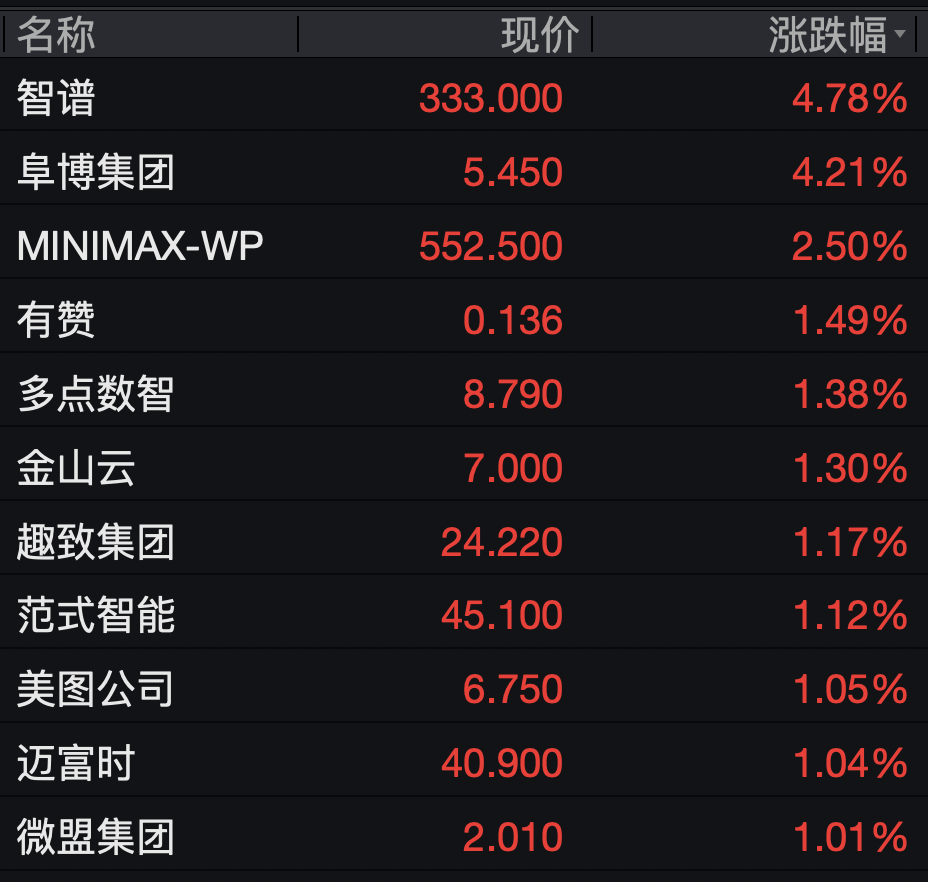 AI大模型概念延续强势,智谱再度高开,涨近5%。MINIMAX-WP涨超2%。