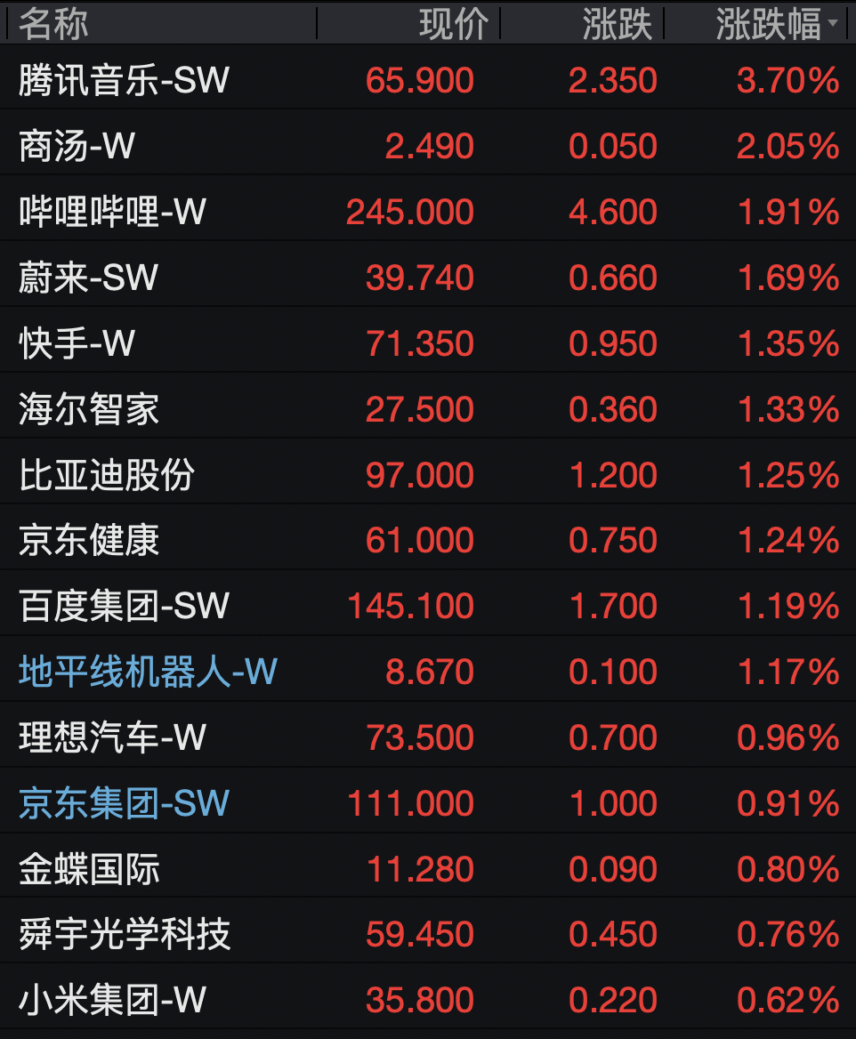 科网股多数上涨,腾讯音乐涨超3%,商汤涨超2%,哔哩哔哩、快手、百度集团等均上涨。