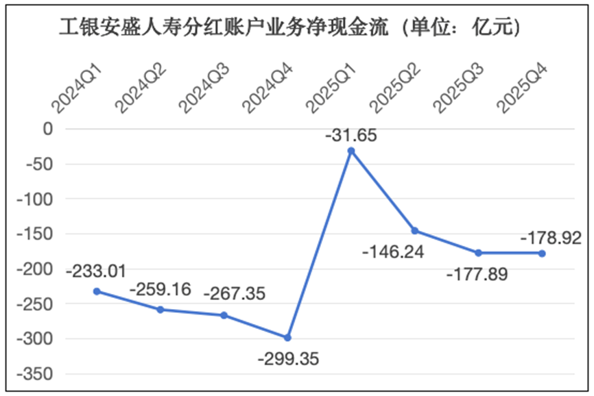 一是,工银安盛人寿分红险账户业务净现金流下降较快,近年来持续为负,如2024年末为-299.35亿元,2025年末达-178.92亿元,这也说明了该公司的分红险所支付的现金流量持续大于所获得的现金流量,面临非常严峻的给付压力。