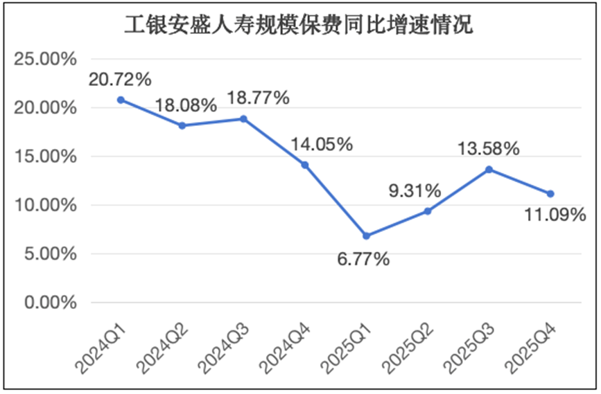 这三点我们也能从其业绩报告中找到一些印证。首先,产品季节性销售与规模保费增速互为因果,若该指标存在较大增长压力,意味着保险产品销售情况不佳,会进一步影响到保费收入。数据显示,2025年Q1-Q4,工银安盛人寿规模保费同比增速分别为6.77%、9.31%、13.58%、11.09%,分别较2024年同期的20.72%、18.08%、18.77%和14.05%较高增速,都有不小的差距和缩减,这说明该公司规模保费增速在显著放缓,短期内面临一定压力。