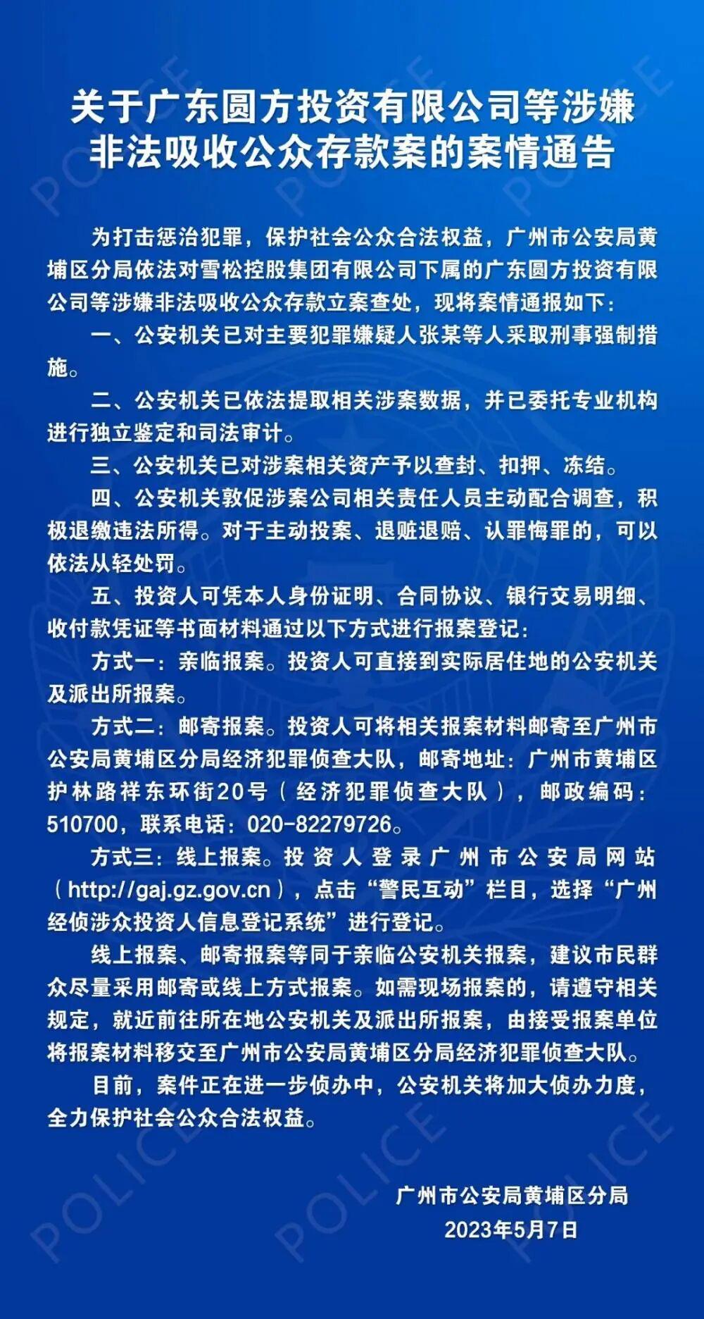 2023年5月7日,广州警方通告,因涉嫌非法吸收公众存款,雪松控股下属多家公司被立案查处,张劲等人被采取刑事强制措施。