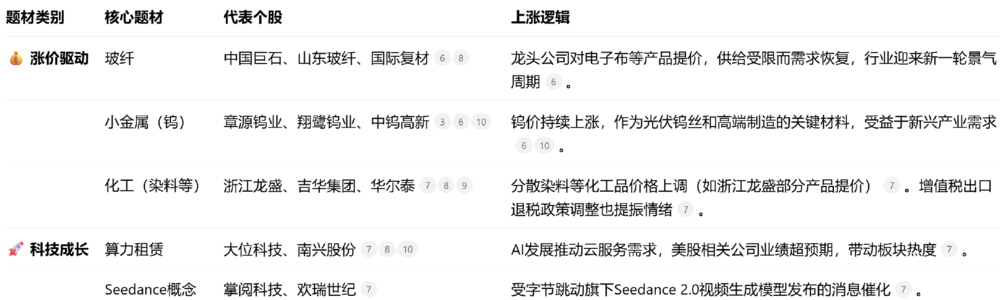 今日资金主要围绕“产品涨价”和“科技成长”两条主线进行布局,不同题材间的分化非常明显。下表汇总了今日表现强势的主要趋势题材及其核心信息。