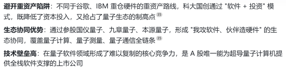 科大国创在量子计算领域的最大优势在于其独特的战略定位。与国盾量子专注超导硬件攻坚不同,科大国创走出了一条 "更聪明的差异化赛道"—— 专注量子软件与算法,成为量子世界的 "操作系统开发商"。