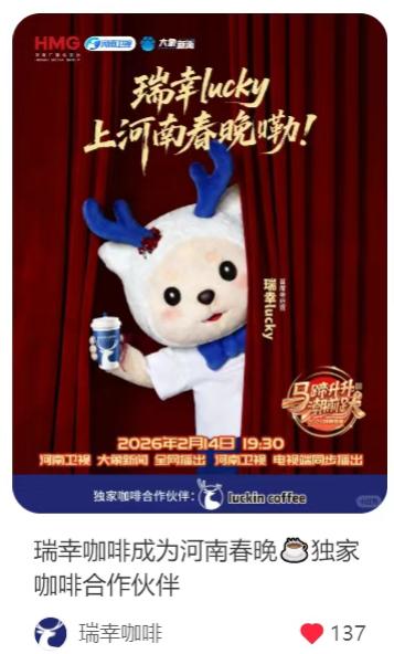 只是蜜雪冰城没有抢到“独家”,作为老对手瑞幸很快官宣成为“河南春晚独家咖啡合作伙伴”,从线下到春晚两家的竞争无处不在。