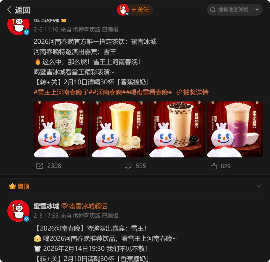 蜜雪冰城在微博上也将自己上河南春晚的消息置顶,且置顶了两条,内容都是将蜜雪冰城上河南春晚放在第一句,2月6日的微博置顶中身份是河南春晚官方唯一指定茶饮、特邀演出嘉宾,并随机做了广告,2月10日转发加关注,请网友喝30杯香蕉撞奶,网友评论称相比花车游街,这才送了30杯奶茶。在最近几天的微博发文中,蜜雪冰城几乎每天都在发春晚相关的内容,比如“勿扰,雪王在2026河南春晚节目拍摄现场~”,可见蜜雪冰城对上春晚的重视。