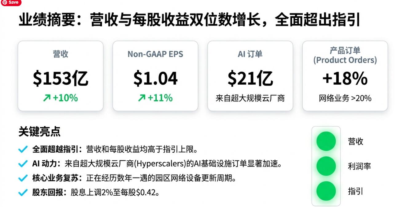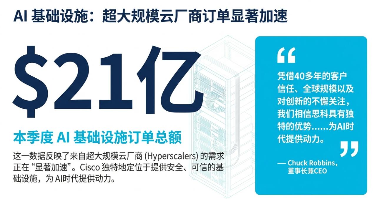 产品订单同比增长18%,且各地区均实现加速增长网络相关产品订单增速超过20%来自超大规模云服务商的AI基础设施订单达21亿美元,显示AI相关需求在公司口径下出现明显提速。