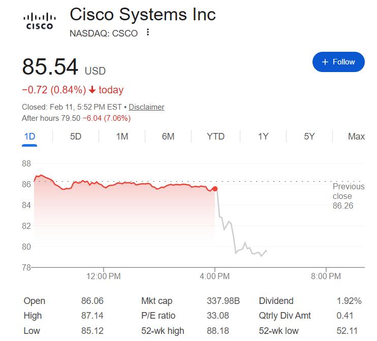 美东时间11日周三思科公布后,当天收跌逾0.8%的思科股价未能扭转跌势,反而在盘后交易中跌幅扩大到7%以上。作为AI热潮的赢家之一,思科股价2025年累涨约30%。