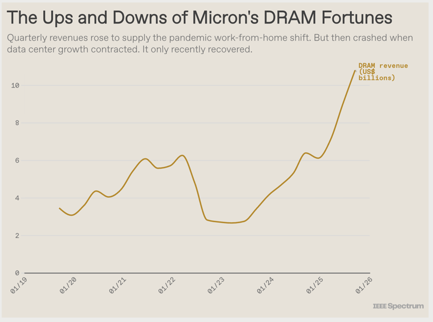 电子行业是如何陷入如今这般困境的?更重要的是,它又该如何摆脱困境?IEEE Spectrum采访了经济学家和存储器专家,请他们对此进行解释。他们认为,如今的局面是 DRAM 行业历史上长期存在的繁荣与衰退周期,以及规模空前的 AI 硬件基础设施建设相互碰撞的结果。而且,除非 AI 领域出现重大崩盘,否则新增产能和新技术需要数年时间才能使供应与需求相匹配。即便如此,价格也可能依然居高不下。