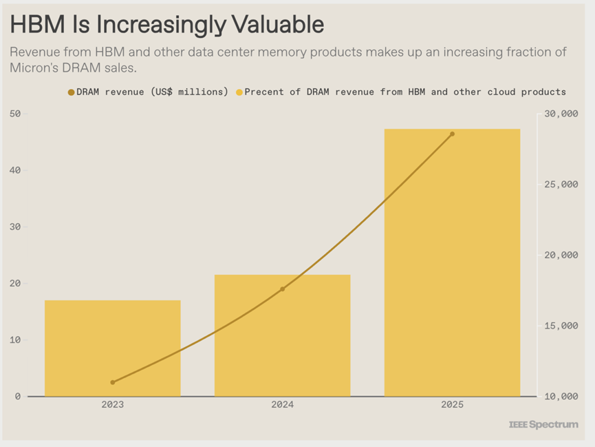 由于需求旺盛,HBM在DRAM制造商的收入中所占比例越来越高。美光(Micron,排在SK海力士和三星之后的第三大DRAM生产商)报告称,HBM和其他云相关内存产品在其DRAM收入中的占比将从2023年的17%增长到2025年的近50%。