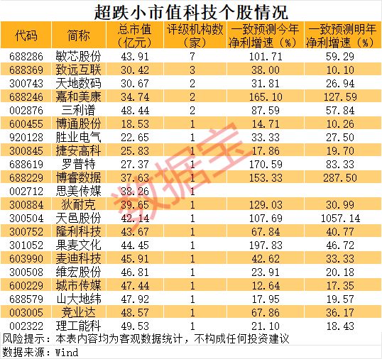据此,证券时报·数据宝统计出超跌小市值科技股,这类个股弹性或更大。数据显示,最新价较历史高点跌超50%且最新市值低于50亿元的科技股中,有21只个股属于TMT板块(传媒、计算机、电子、通信四大行业)且有机构评级。