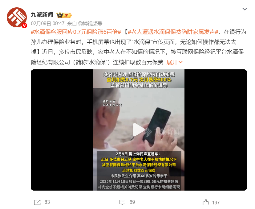 近日,据“上海民声直通车”报道,多位市民反映,家中老人在不知情的情况下,被互联网保险经纪平台水滴保险经纪有限公司(以下简称“水滴保”)连续扣取数百元保费。