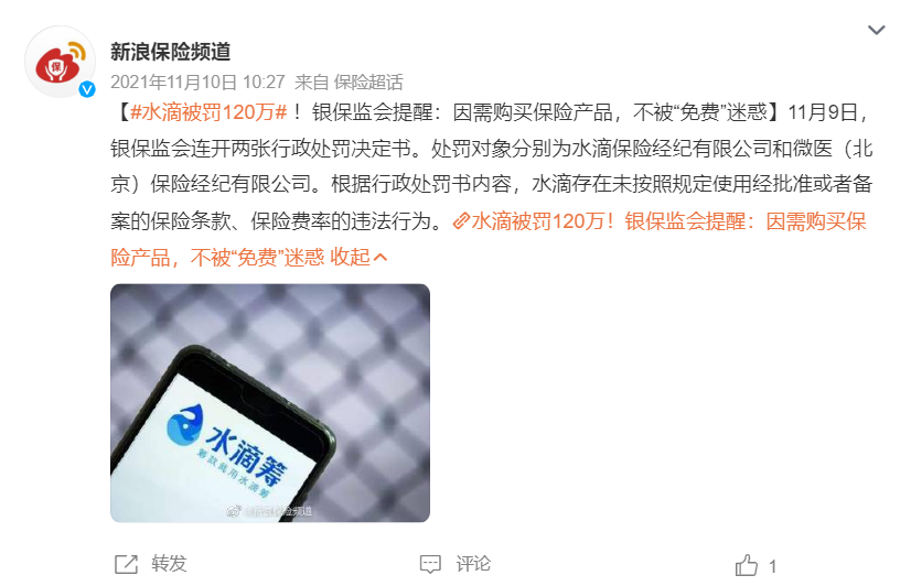 2021年,银保监会公布对水滴保的罚单,并指出水滴保存在按照“首月0元”、“首月3元”销售保险产品的情况,属于“未按照规定使用经批准或者备案的保险条款、保险费率的行为”。针对上述违法行为,共计处罚水滴保母公司水滴公司100万元。并对时任水滴经纪总经理杨光和水滴经纪精算部负责人张强,分别处以警告并罚款10万元。