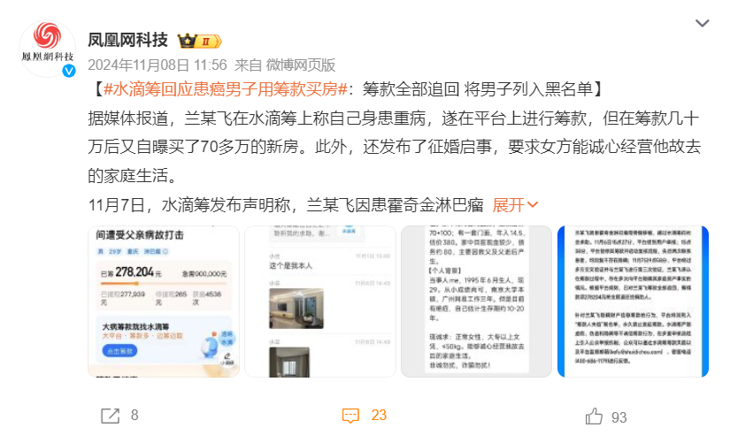 不过,水滴保的这一商业模式近年来也引发了争议。2024年,据媒体报道,一位用户在水滴筹上称自己身患重病,遂在平台上进行筹款,但在筹款几十万后又自曝买了70多万的新房。此外,还发布了征婚启事,要求女方能诚心经营他故去的家庭生活。随后,水滴筹发布声明,已对该用户筹款全部追回,筹得款项将全额退还给捐助人,并将其列入“筹款人失信”黑名单,永久禁止发起筹款。